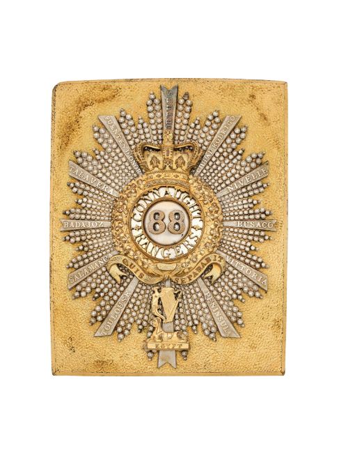 the rectangular seeded gilt plate (slightly rubbed) with burnished borders, surmounted by a white metal seeded star with eleven battle honours, crowned shamrock wreath to centre voided ‘CONNAUGHT RANGERS’ circlet centred by ‘88’, scroll beneath inscribed 'QUIS SEPARABIT', a gilt Irish harp beneath and Sphinx inscribed 'Egypt', two hooks and two studs to reverse