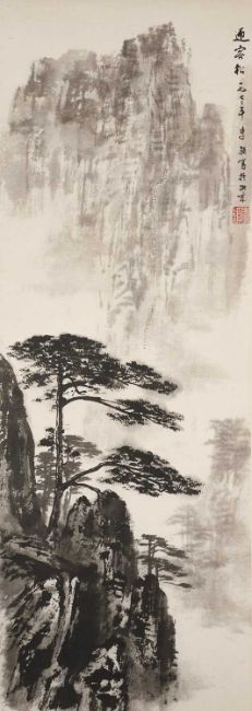 ink on paper, depicting the 'Welcoming-guest-pine' at Huangshan mountain, signed by the artist and inscribed 'painted in Peking in 1973', seal of the artist, mounted as a hanging scroll, 79 by 28cm