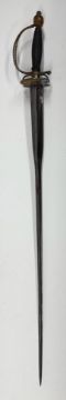 the first with bright blade of hollow diamond section, hilt of characteristic form and entirely composed of cut-steel beads in imitation of brilliants (quillon tip repaired and detached, knuckle-chain partly detached), in its steel-mounted vellum-covered scabbard (tip slightly bent); the second with colichemarde blade, plain steel hilt and wooden grip (wire binding missing, surface rust and old pitting); the third a reproduction, with bright etched, blued and gilt blade, copper-alloy hilt cast with profile portrait bust medallions and foliage, and wire-bound grip, in its leather scabbard with cast copper-alloy locket and chape; the last with copper-alloy hilt cast with rocailles, the first: 80.0 cm blade (4)