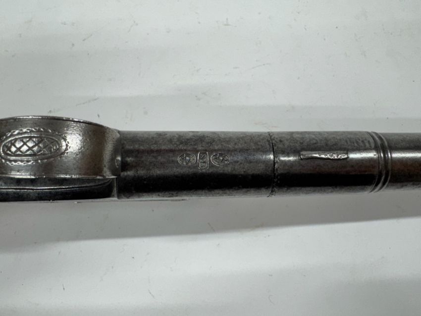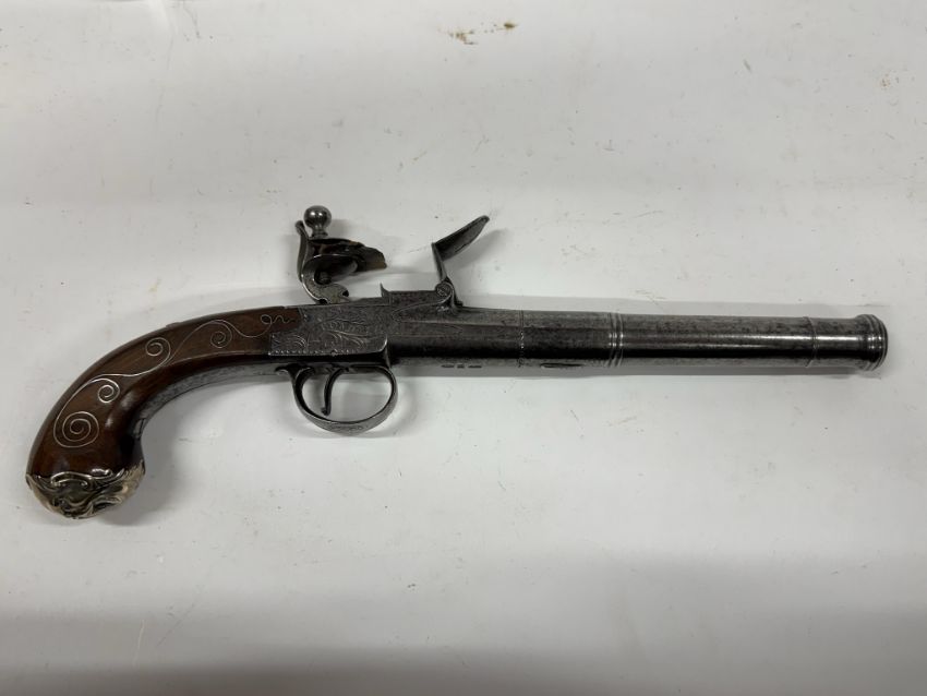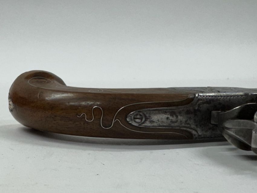 with turn-off cannon barrel, engraved action signed on one side (top jaw and screw replaced), flat-sided figured butt inlaid with silver wire scrollwork, and silver grotesque mark butt-cap, 13.0 cm barrel