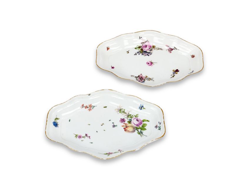 decorated with deutsche Blumen within gilt-line rims, blue crossed swords marks, 23.5cm wide, minor wear and fritting