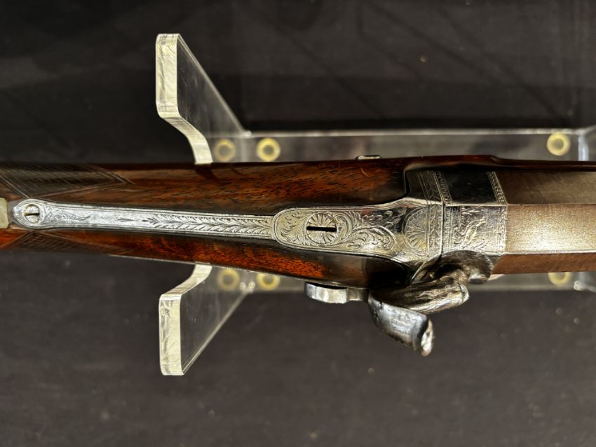 with rebrowned twist two-stage sighted barrel, octagonal breech becoming polygonal and struck with Birmingham proof marks along the bottom flat, breech engraved with a gamebird, foliate engraved tang and mounts (butt-plate worn and pitted), signed border engraved back-action lock decorated with pheasants in a landscape, figured half-stock with white-metal fore-end cap, and chequered grip, vacant white-metal escutcheon, and later ramrod (steel parts polished bright); together with a large Sykes patent powder-flask with bag-shaped leather body (large gilt and tooled patch on one side), and another powder-flask with copper-alloy body embossed with reeding on both sides, 83.7 cm barrel (3)