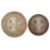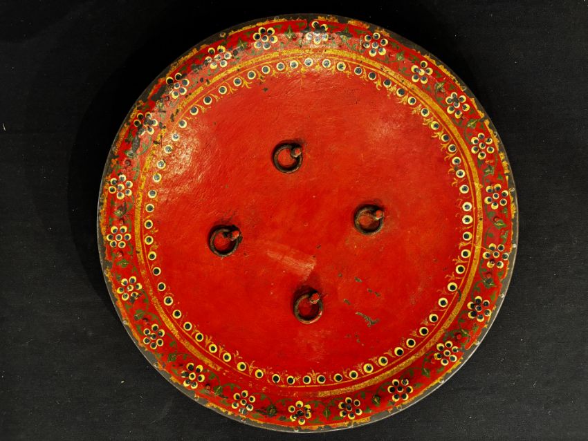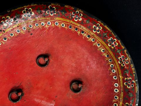the first (surface rust) with copper-alloy mounts including four domed bosses centred on a pierced border; the second with four petalled bosses, the inside painted in polychrome, 43.5 cm and 35.0 cm diameter (2)