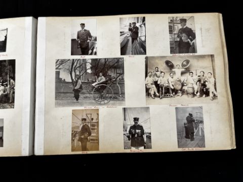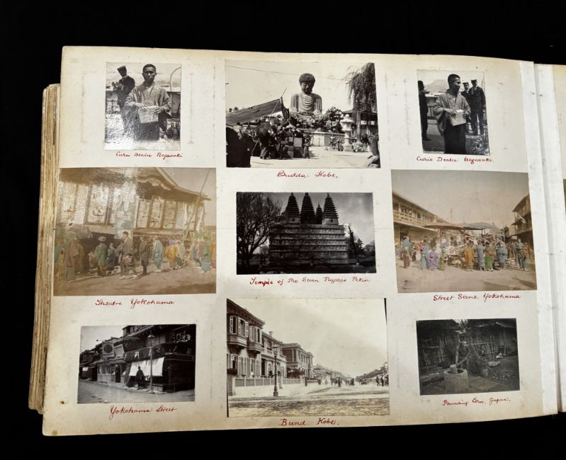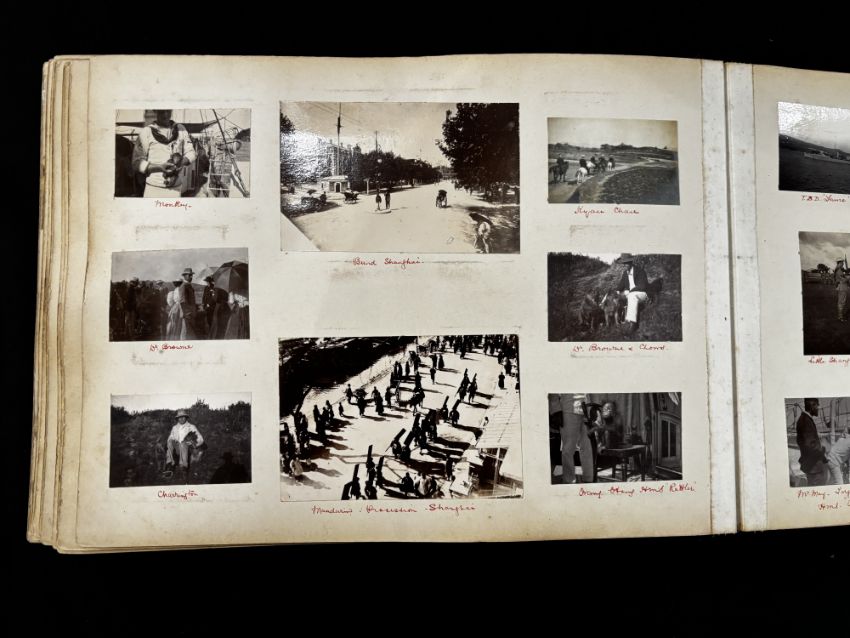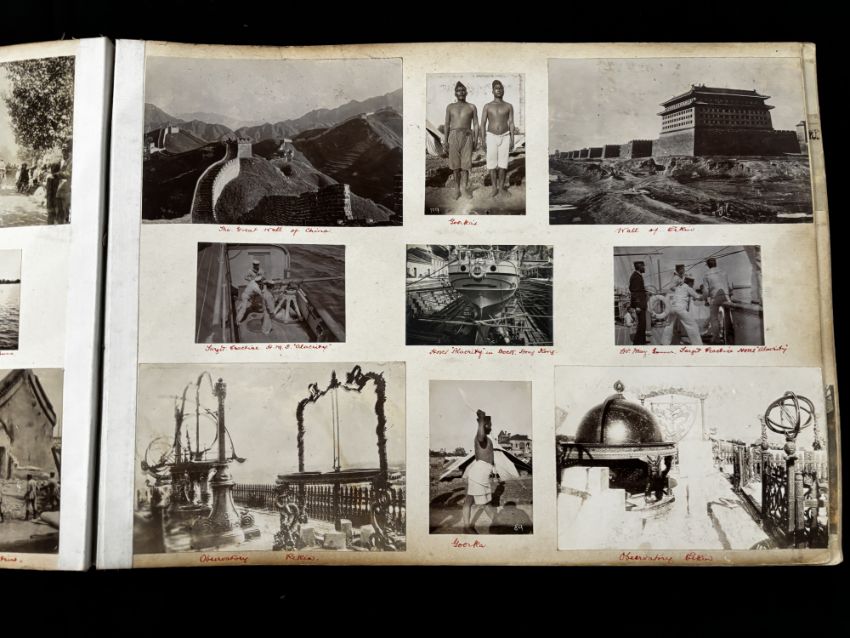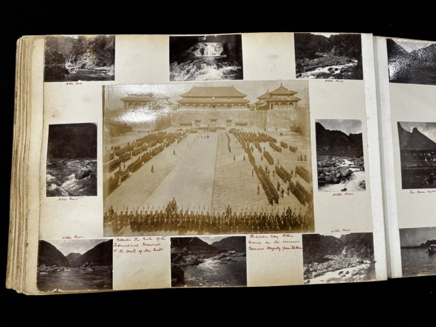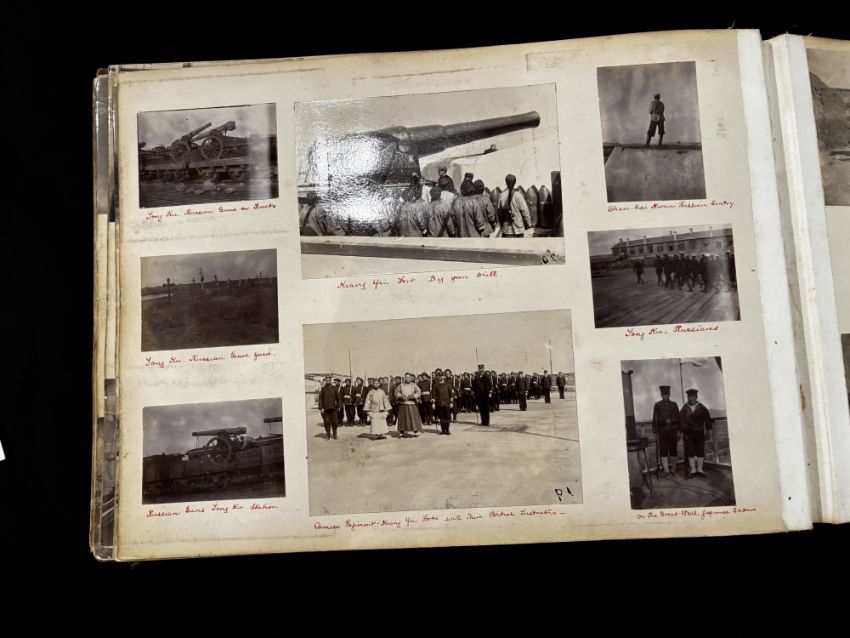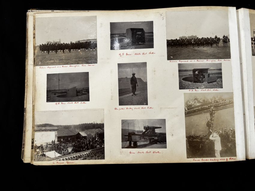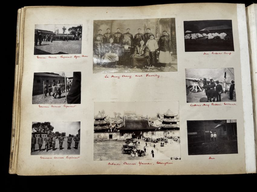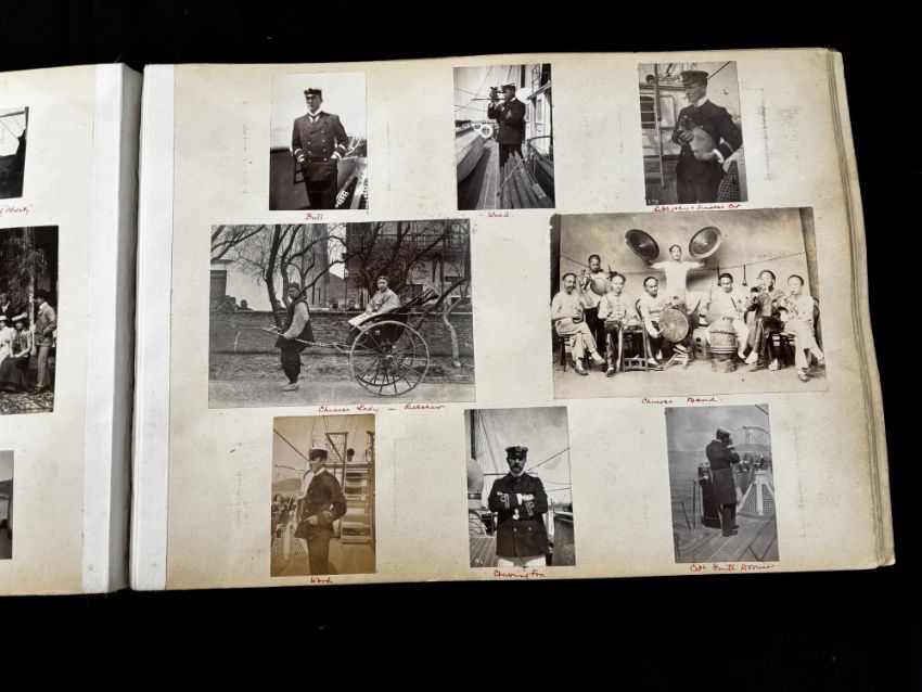 This important historical photograph album appears to have been compiled by a British officer serving on HMS Alacrity in the China Squadron during the time of the Boxer Rebellion (1900-1901). The 11 larger photographs include a view of Shanghai, and a group photograph taken in Nankin in 1900 recording an important meeting in Nankin between the British and Chinese, showing Admiral of the Fleet Sir Edward Seymour and senior Chinese officials in Nankin, the officers and officials identified in a contemporary hand as the Viceroy of Nankin, Liu Kunyi (‘Liu Kun Yi’, 1830-1902; although other contemporary sources name the person in this photograph as Li Hongzhang), Taotai of Nankin, Consul General Warren (Shanghai), Flag Captain Jellicoe of HMS Centurion, and others.