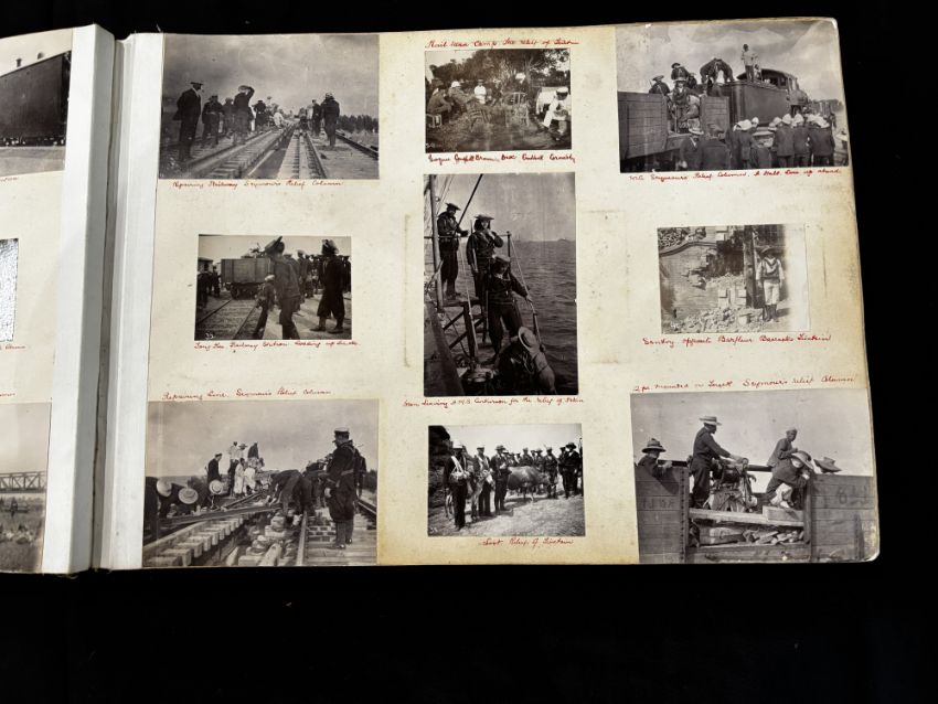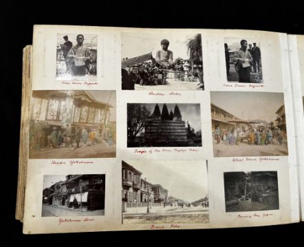 oblong folio (285 x 380mm), 11 larger photographs and approximately 490 smaller photographs, mounted on album leaves recto and verso, various processes, mostly silver gelatin prints, some albumen, contemporary manuscript ink captions throughout (one album leaf detached and frayed, some fading and dust-stains), contemporary black half roan, moiré cloth boards (binding rather rubbed, lacking backstrip)