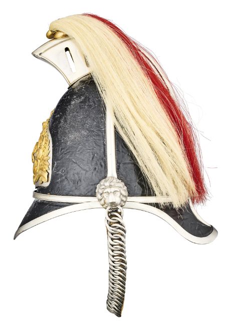 with tall black patent leather skull (old crazing) and vertical domed strips of white metal to sides and back, white-metal crest with slotted sides and top bearing a red and white horsehair plume, drooping to the left, shaped white-metal plate to front of skull mounted with a fine gilt device of the Royal Crest above the VR cypher within an oval inscribed QUEEN'S OWN REGIMENT, flanked by the Lion and Unicorn above the regimental title, the front and back peaks of black leather, with white-metal edging, fine white-metal chin-chain, attached by lion's head bosses, the headband of quilted black silk