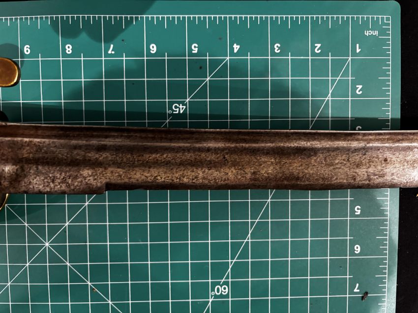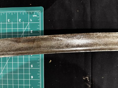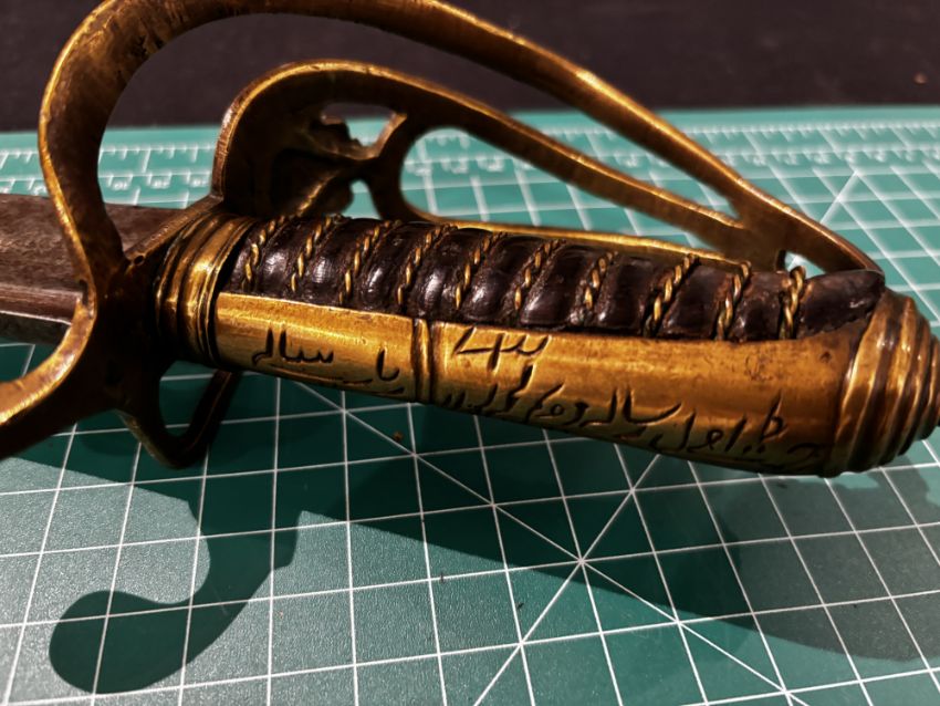with curved fullered blade (old rust patination) double-edged towards the point (bent), copper-alloy hilt of regulation type incorporating a coat-of-arms, probably of Punjab, the back-piece with engraved inscription in nasta’liq, and wire-bound wooden grip, 77.5 cm blade