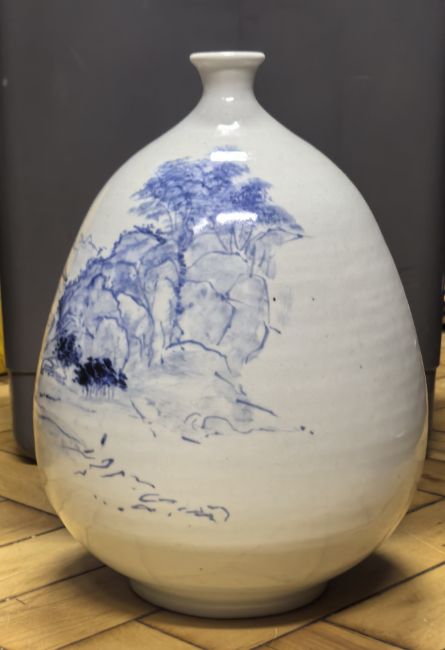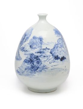 the pear-shaped body rising from a short foot to a short, narrow, flaring neck, painted around the exterior with a mountainous landscape, 32cm high