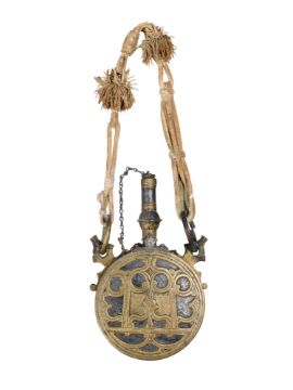 of copper-alloy chased with raised symmetrical scrollwork on both sides, one side engraved with a ground of foliate designs, the other with grounds of silver engraved en suite, tubular nozzle, with chained stopper, two pierced suspension mounts each with a ring for the suspension cord, 19.5 cm high