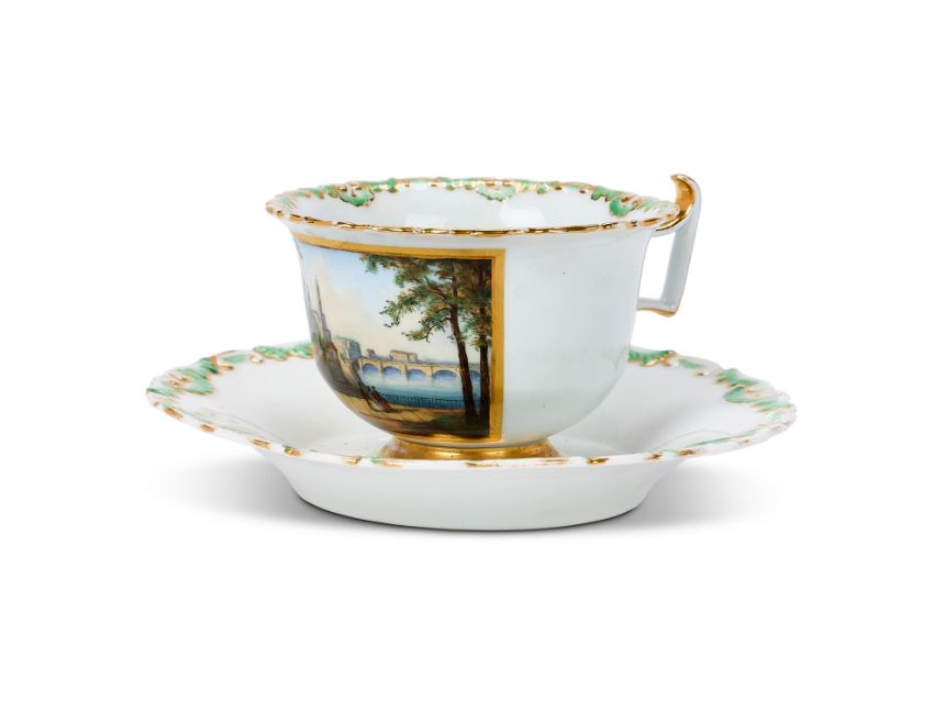 A MEISSEN PORCELAIN TOPOGRAPHICAL TEACUP AND SAUCER, MID 19TH CENTURY