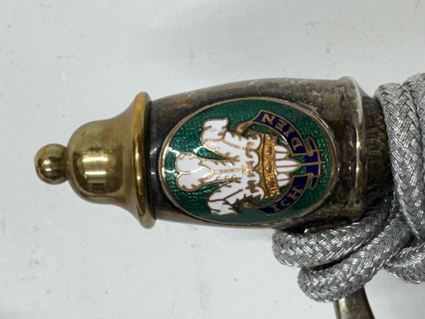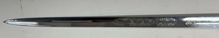 the bright etched blade inscribed ‘To Commemorate the Marriage of The Prince of Wales and Lady Diana Spencer 29 July 1981’, cast and silvered hilt with polychrome enamelled coats-of-arms comprising the royal arms and those of the Prince of Wales and the Spencer family, wire-bound grip, and retaining its sword-knot, 80.8 cm blade