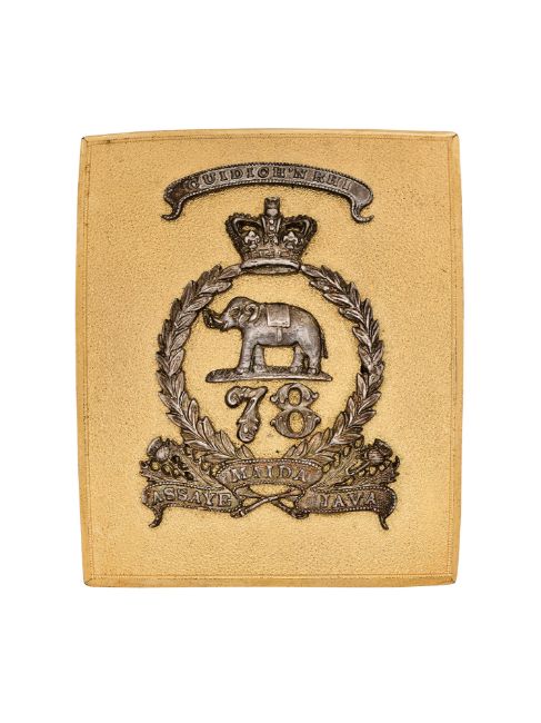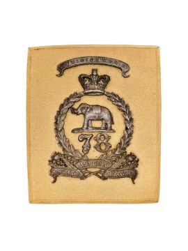 the seeded gilt rectangular plate with burnished edges, blackened white-metal mounts comprising scroll inscribed ‘CUIDICH'N RIGH’, thistle wreath below with battle honours ‘ASSAYE’, ‘MAIDA’ and ‘JAVA’, surrounding an elephant and floreated ‘78’, two hooks and two studs to reverse, together with leather backing
