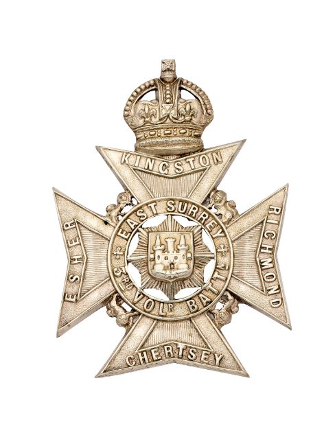 with crowned Maltese cross, each arm bearing a town, ‘KINGSTON’, ‘RICHMOND’, ‘CHERTSEY’ and ‘ESHER’, a circlet to centre inscribed ‘EAST SURREY VOLR. BATT’ surrounding the East Surrey regimental crest on an eight-pointed star, with three screw posts to reverse