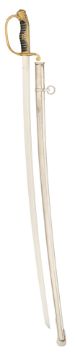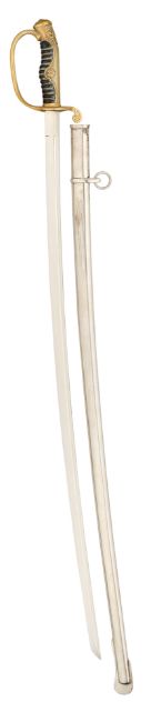 of regulation pattern, with plated slender fullered blade, copper-alloy hilt cast with foliage including on the pierced side-guard, and wire-bound black composition grip, in original nickel-plated scabbard, 78.0 cm blade