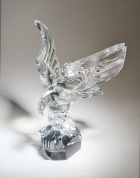 modelled with wings outstretched landing on an asymmetric base, etched to base 'Crystal de Sevrès', 32cm high, chip to wing