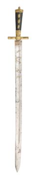 with bright fullered blade (old rust patination) lightly etched and gilt on both sides of the forte with foliage, one side involving a trophy and a running stag, the other with a hound pursuing a hare, copper-alloy hilt (guard missing) retaining some of its gilding and including a row of three ovals one each side of the ebonised grips, 64.3 cm blade