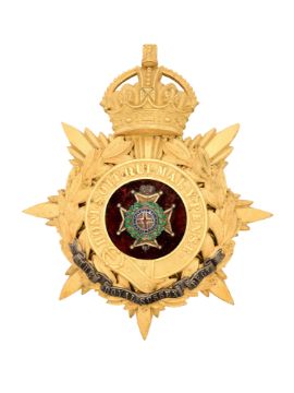 with gilt crowned star mounted with Garter resting in laurel sprays bearing gilt scroll 'THE ROYAL SUSSEX REGIMENT', red velvet centre bearing silvered Roussillon plume and Maltese cross enamelled regimental device, with three loops to rear