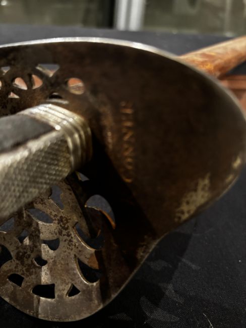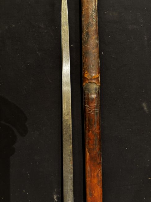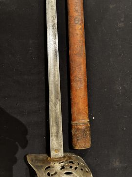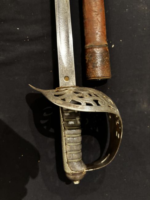 of regulation pattern, with etched fullered blade (old wear), the inside of the rear of the guard engraved with owner’s name ‘R. CONNER’, the hilt retaining traces of silvering, in its scabbard covered in brown leather (old damage), and retaining its brown leather travelling cover (seam partly open, flap missing), 82.0 cm blade (2)