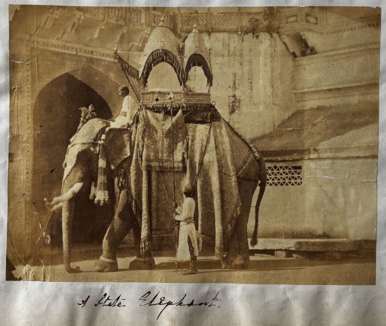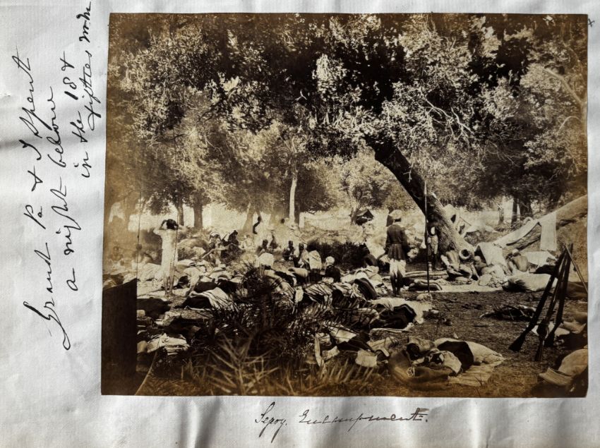 The photographs include ‘A Delhi Picnic, Entertainment given by Bachelors of Delhi to Residents & visitors’ (circa 1868) photographed by [John Christian Andrew] ‘Dannenberg of Mussoorie’; three portraits of British Indian army officers (one a salt print); 10 views in and around Fyzabad (Faizabad) in Oudh, northern India; a portrait of four native Indians, including a Sepoy (circa 1860); ‘Grand Durbar held at Lahore on 18th January 1862 by Sir Robert Montgomery G.C.B.’; ‘Sepoy encampment’; ‘Riding Camels with Rajpoots’; Mrs W. Tucker and first born’; ‘Entrance into Lahore Fort, July 1864’; and ‘Our Hydrabad House, near Lucknow, Oude A.D. 1859’ (image torn).