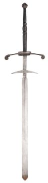 with broad double-edged blade of flattened hexagonal section partly below the rectangular ricasso, the latter with two down pointed side-lugs, and struck with a fleur-de-lys shaped mark on one side, hilt comprising side-rings each enclosing a scrolled fleur-de-lys, downcurved quillons each with three scrolls at the tip, fluted fig-shaped pommel, and leather-wrapped grip with central swellings, 114.2 cm blade