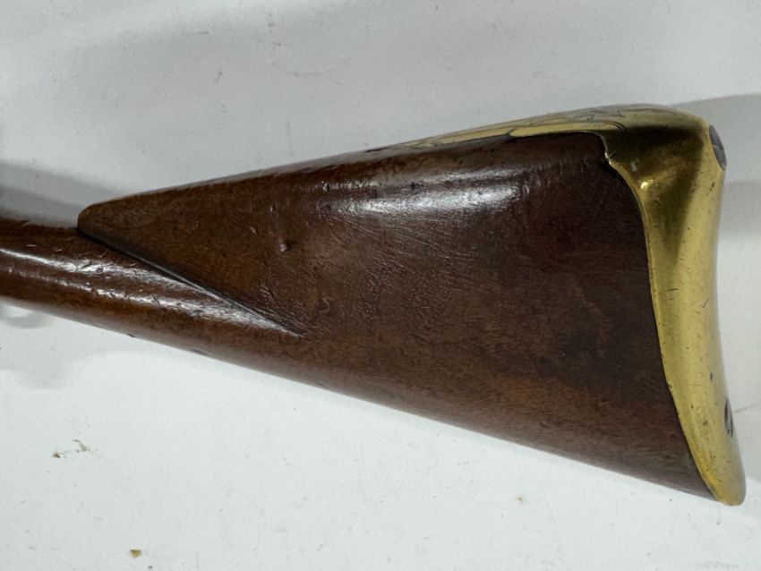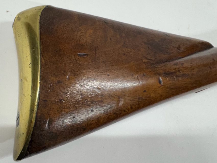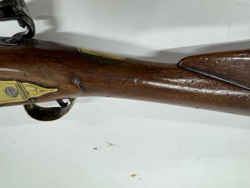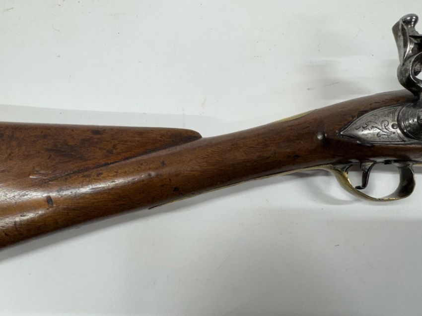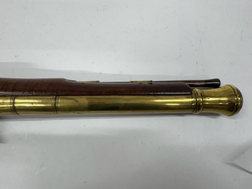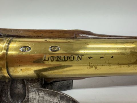the three-stage barrel turned and belled at the muzzle, and struck with London proof marks, rounded lock lightly engraved with foliage, figured full stock, engraved copper alloy mounts including butt-plate decorated with a crossed bow and quiver on the heel tang, and later horn-tipped ramrod, 40.0 cm barrel