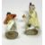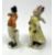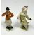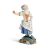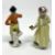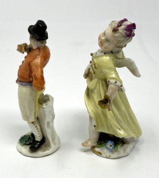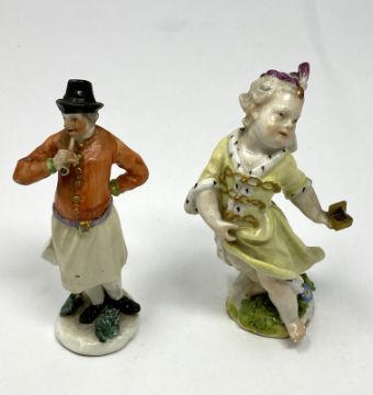 the Cupid modelled standing wearing a yellow ermine-lined robe and feathered headdress, a small gold snuff-box in her left hand, 8.5cm high, the man standing wearing an orange jacket and black hat, a pipe raised to his mouth, indistinct blue crossed swords marks to back of bases; together with a German porcelain figure of a girl, probably Höchst,19th century, after the model by J.P. Melchior, standing with her right arm outstretched, on a grassy rocky base, crowned blue wheel mark, 13.4cm high (3)