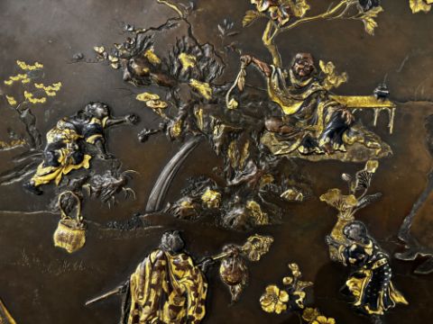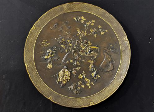 the broad flaring foliate rim with geometric design, encircling figures in takazogan in a garden, 40cm diameter