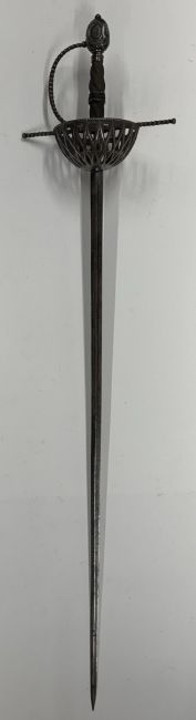 the first with blade of flattened hexagonal section etched with sacred ‘IHS’ on each side and ‘IOPO ANTOIA’ on one side and ‘DA PEDRO’ on the other, cup (some old pitting) embossed and pierced with foliage, quillons and knuckle-guard with button terminals, and twisted wire-bound grip with Turk’s heads; the second with cup pierced with a trellised arrangement of ovoidal piercings, twisted quillons and knuckle-guard, and cast pommel (grip binding loose); the last with cast hilt (some surface rust) including cup involving a vacant shield amid strapwork, the first: 96.6 cm blade (3)