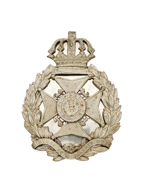 with laurel sprays surmounted by Guelphic crowned blank tablet, surrounding a Maltese cross with lions between the arms and balls to the tips, central circlet inscribed ‘RIFLE BRIGADE’, a crowned strung bugle with, scroll inscribed ‘THE PRINCE CONSORT'S OWN’ to the base, with four screw posts