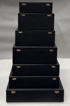 each of leatherette-covered wood and with copper alloy furniture and comprising a square box, the interior shaped for a shallow bowl or vessel (47.0 cm diameter), the second to the sixth similiar to the first (28.0 - 47.0 cm diameter), the seventh similar to the rest but of lesser depth for a plate or flat object (26.0 cm diameter) (all measurements of internal cushioned hollow) (7)
