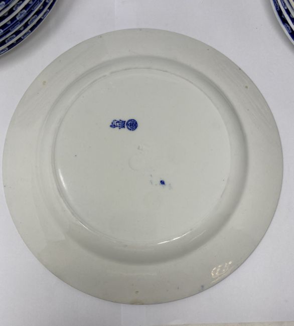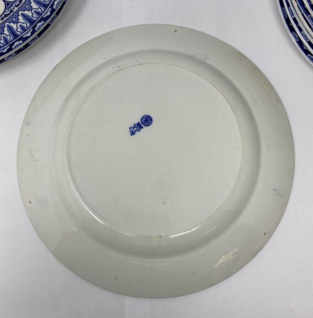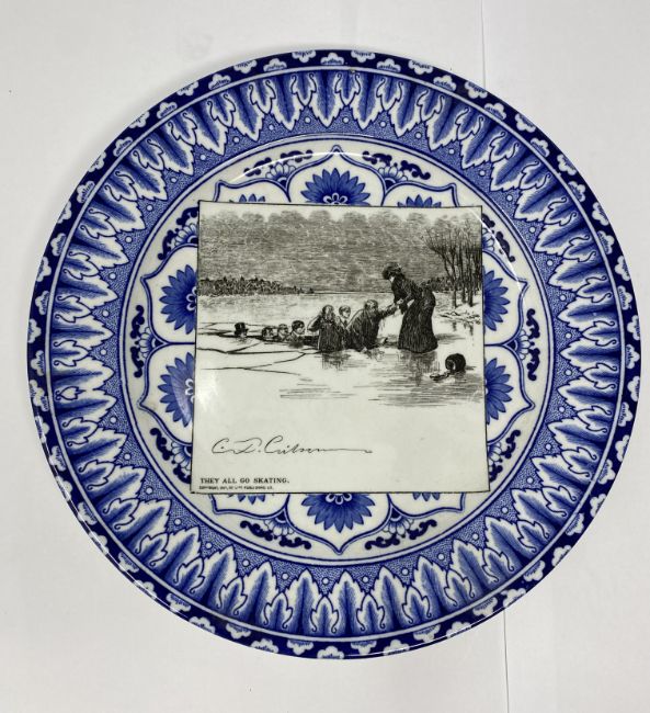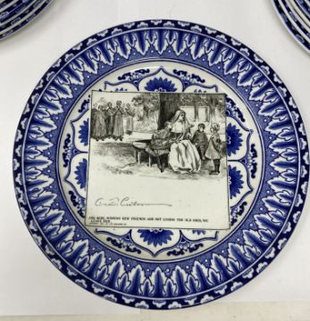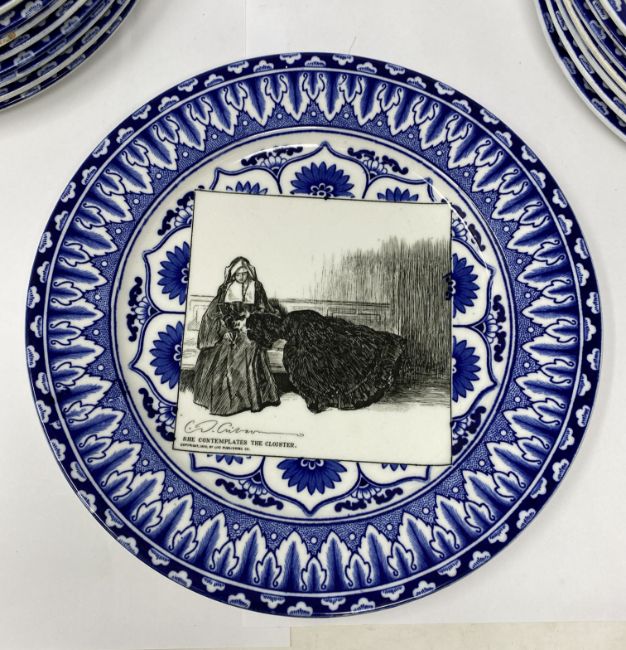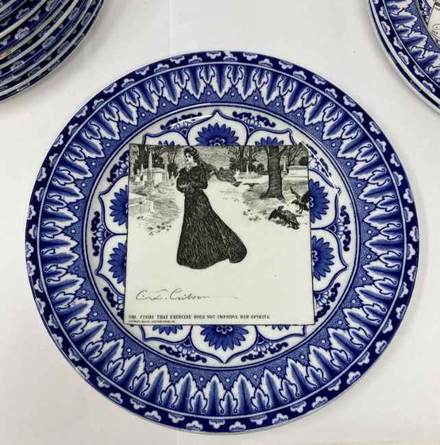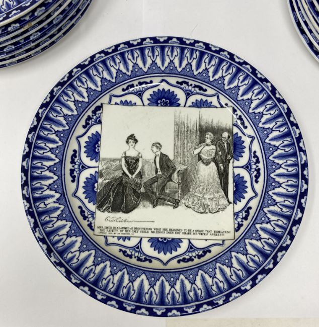 each with blue and white stylised foliate ground reserving a square panel printed in black with differing illustrations after Charles Dana Gibson (1867-1944) describing the episodes in the life of an attractive widow, titled as follows: 'Some think she has remained in retirement too long. Others are suprised that she is about so soon.' (1900); 'Miss Babbles the authoress calls and reads aloud.' (1900); 'She contemplates the cloister.' (1900); 'A message from the outside world.' (1900); 'And here, winning new friends and not losing the old ones, we leave her.' (1901); 'Miss Diggs is alarmed at discovering what she imagines to be a snare that threatens the safety of her only child. Mr Diggs does not share his wife's anxiety. (1900); 'A quiet dinner with Dr Bottles; after which he reads Miss Babble's latest work. (1900); 'The day after arriving at her journey's end.' (1901); 'She becomes a trained nurse.' (1901); 'She finds some consolation in her mirror.' (1900); 'She looks for relief among some of the old ones.' (1900); 'They take a morning run.' (1901); 'She decides to die in spite of Dr Bottles.' (1900); 'She is disturbed by a vision which appears to be herself.' (1901); 'Mrs Babbles brings a copy of a morning paper, and expresses her indignation and sympathy over a scurrilous article. Meanwhile other friends are calling upon the editor.' (1901); 'She finds that exercise does not improve her spirits.' (1900); 'She goes to the fancy dress ball as "Juliet".' (1901); 'They all go skating.' (1901), impressed Doulton Burslem roundels and printed Royal Doulton marks, 26.5cm diameter; together with a signed copy of 'The Langhorne Sisters', by James Fox, London, 1998, with cloth covers and dust jacket (19)