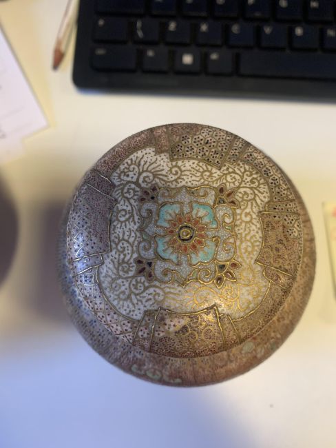 the globular jar finely enamelled and gilt with Shiyei Sennin riding a giant carp, the waisted cover flat, 11.5cm high